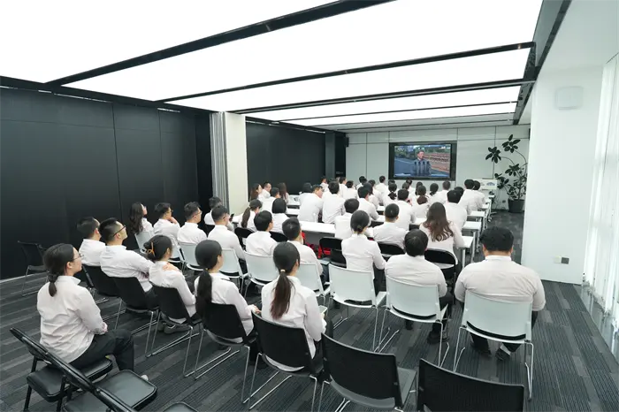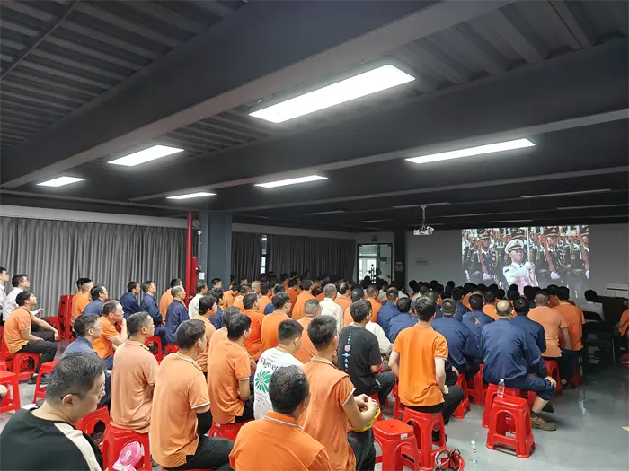 3 septembrie a fost o zi de mare însemnătate pentru întregul popor chinez. În această zi specială, președintele Fujian Quangong Machinery Co.,Ltd, Fu Binghuang și directorul general, Fu Xinyuan, i-au condus pe toți angajații din sala de conferințe ale companiei pentru a urmări marea paradă militară și a asista la acest moment istoric interesant.